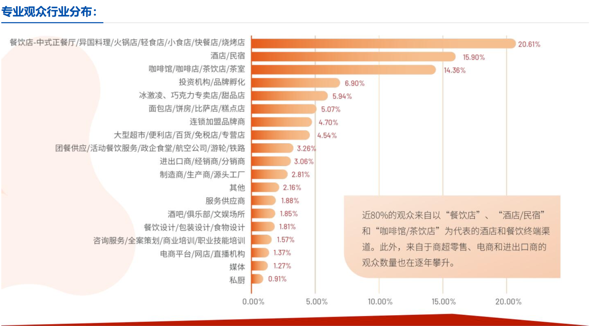 HOTELEX展出了全方位的展品类别。汇聚全球买家资源,面对面治谈;10万专业采购商资源;行业风向标;展会集聚行业各大品牌,产品动向,营销模式..快速获取; 品牌快速传播:新媒体:公众号、抖音、微博;餐饮研究社直播间\权威大众/行业垂直媒体推广